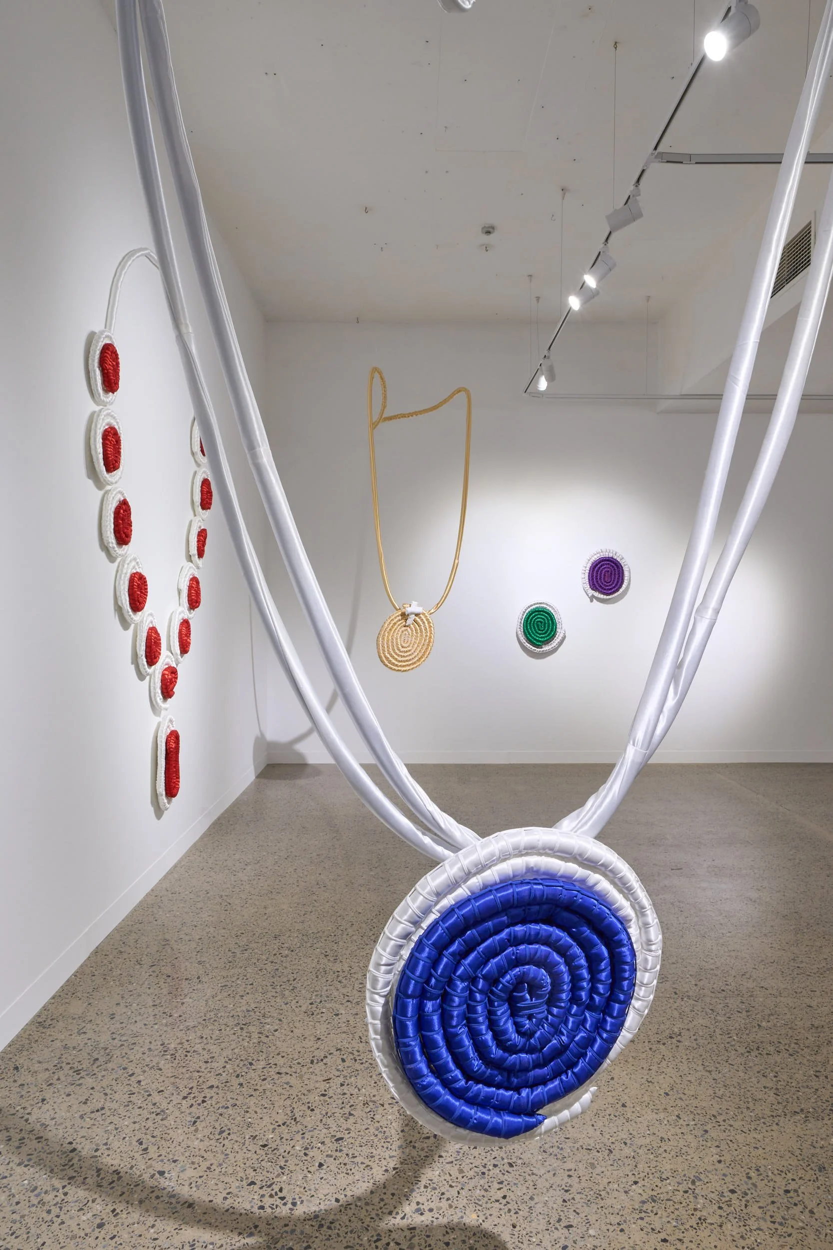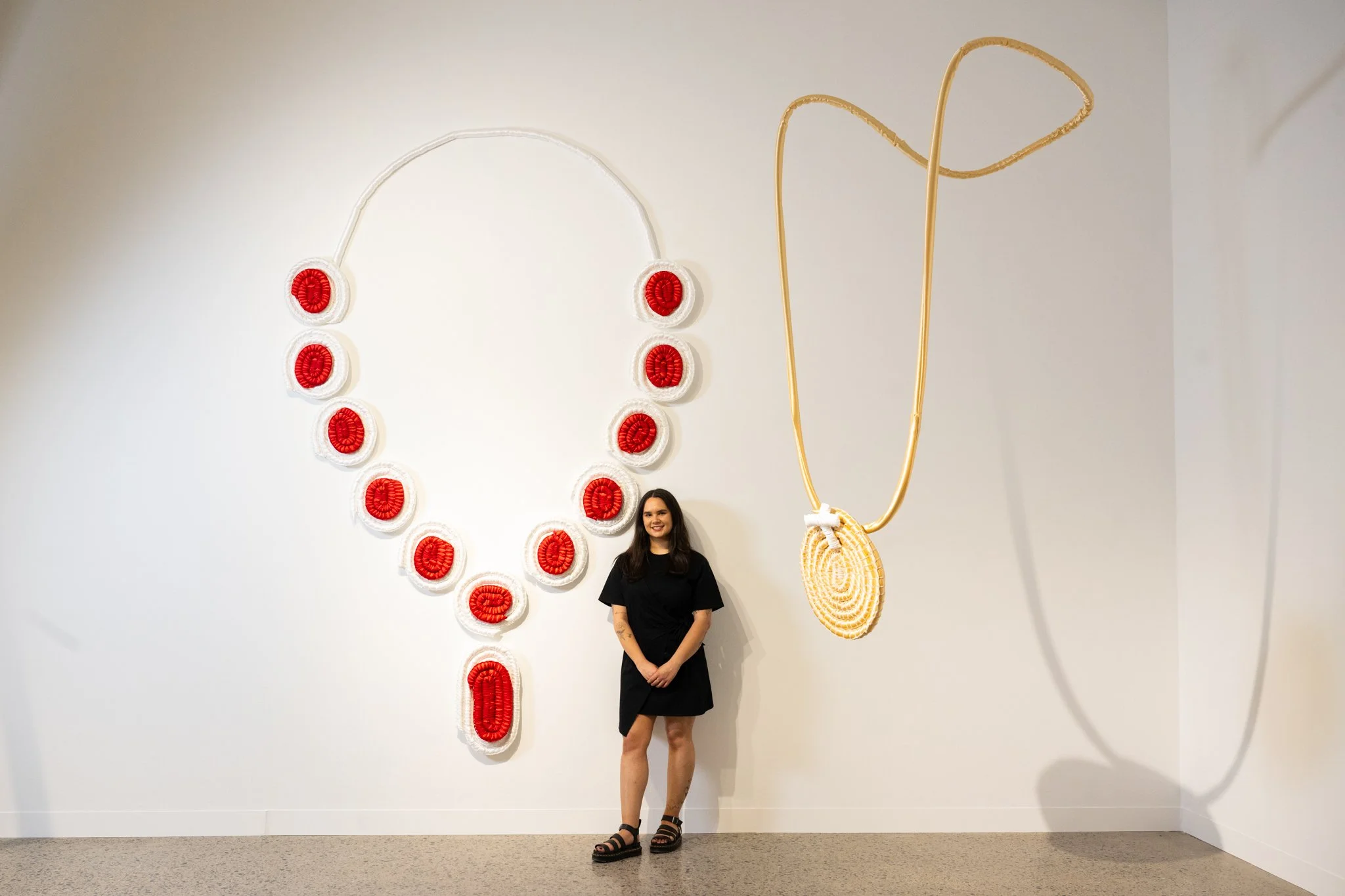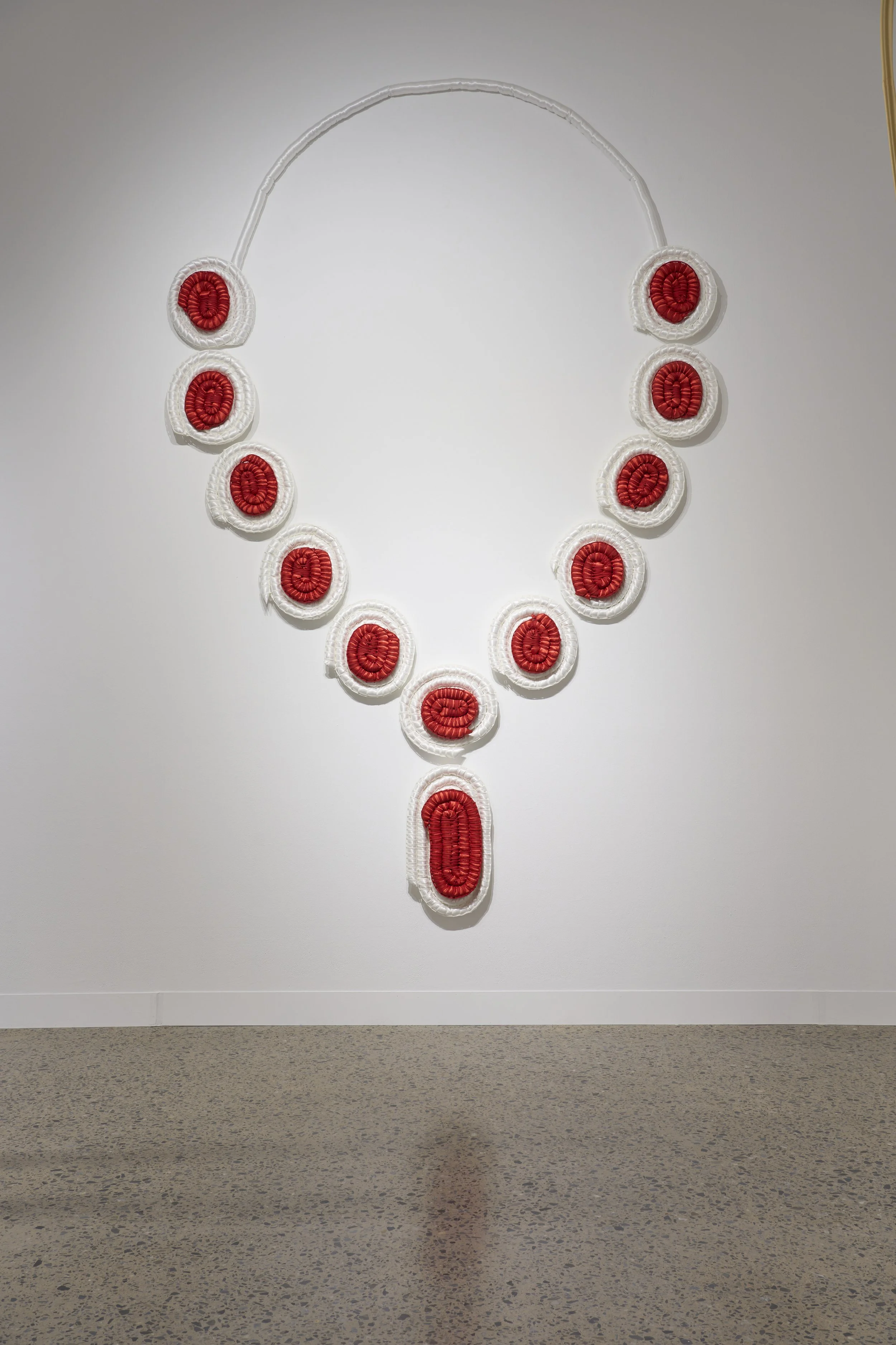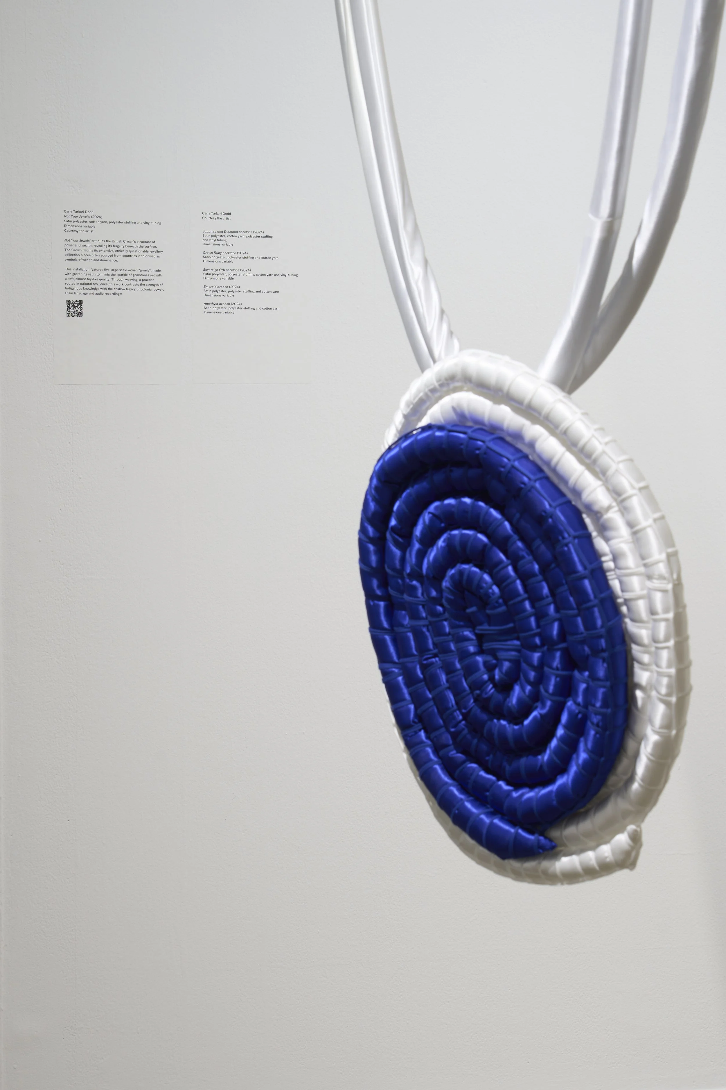 This installation features five large-scale woven “jewels,” made with glistening satin to mimic the sparkle of gemstones yet with a soft, almost toy-like quality. Through weaving, a practice rooted in cultural resilience this work contrasts the strength of Indigenous knowledge with the shallow legacy of colonial power.