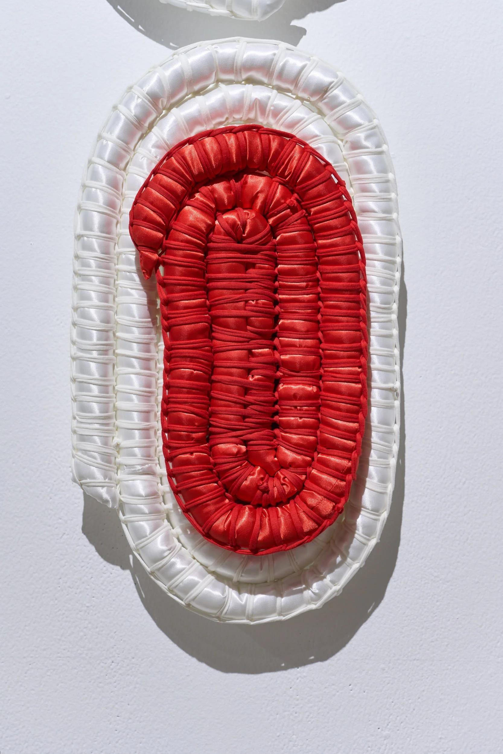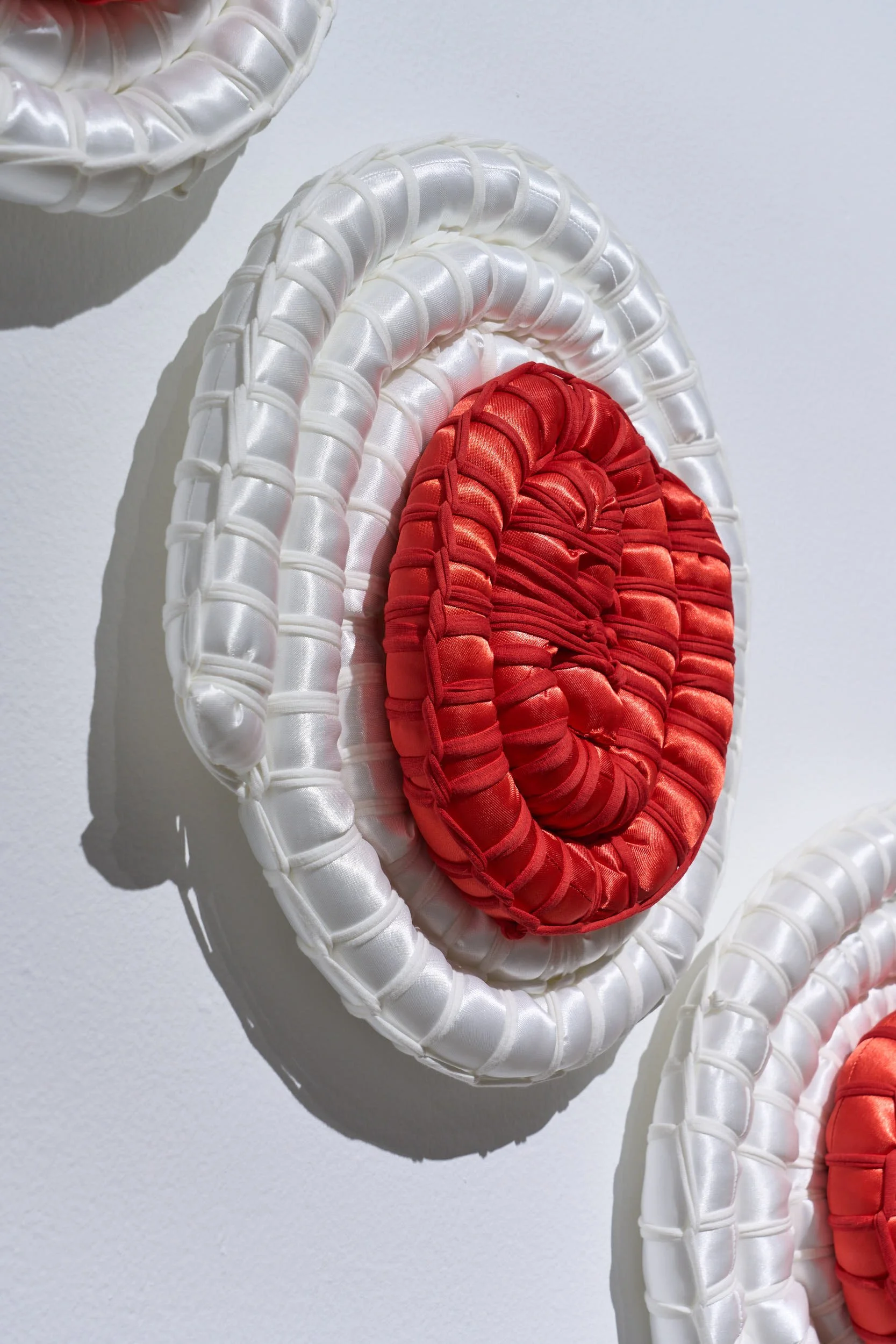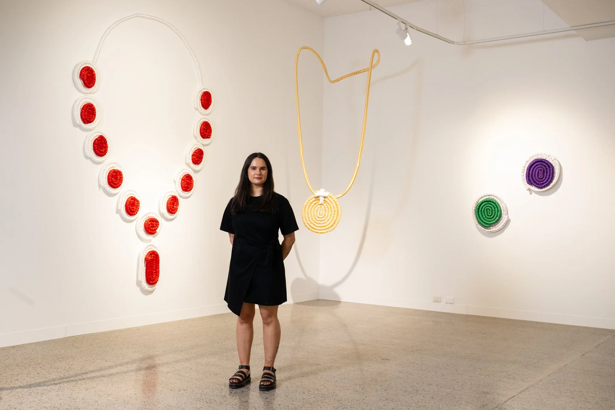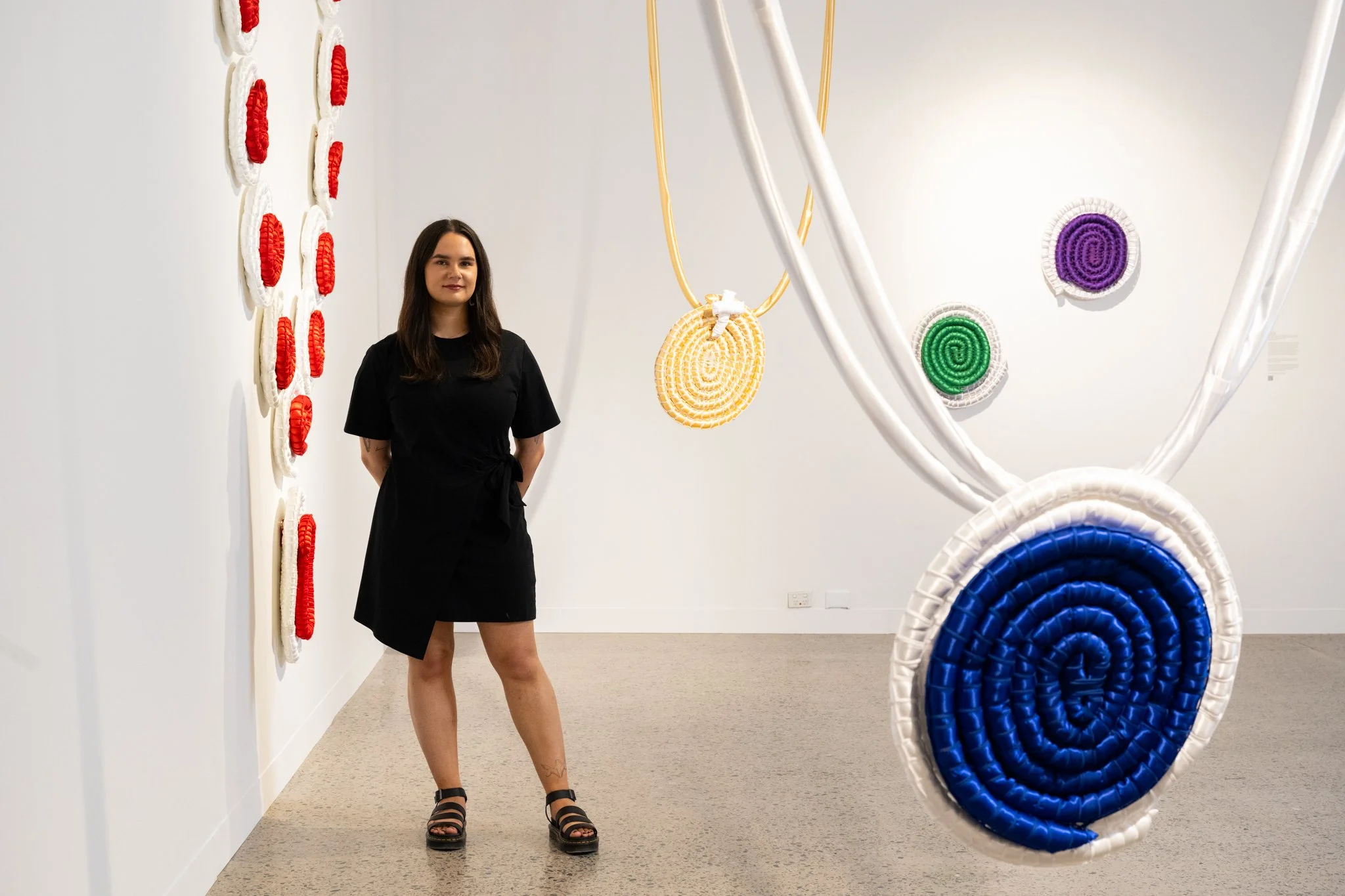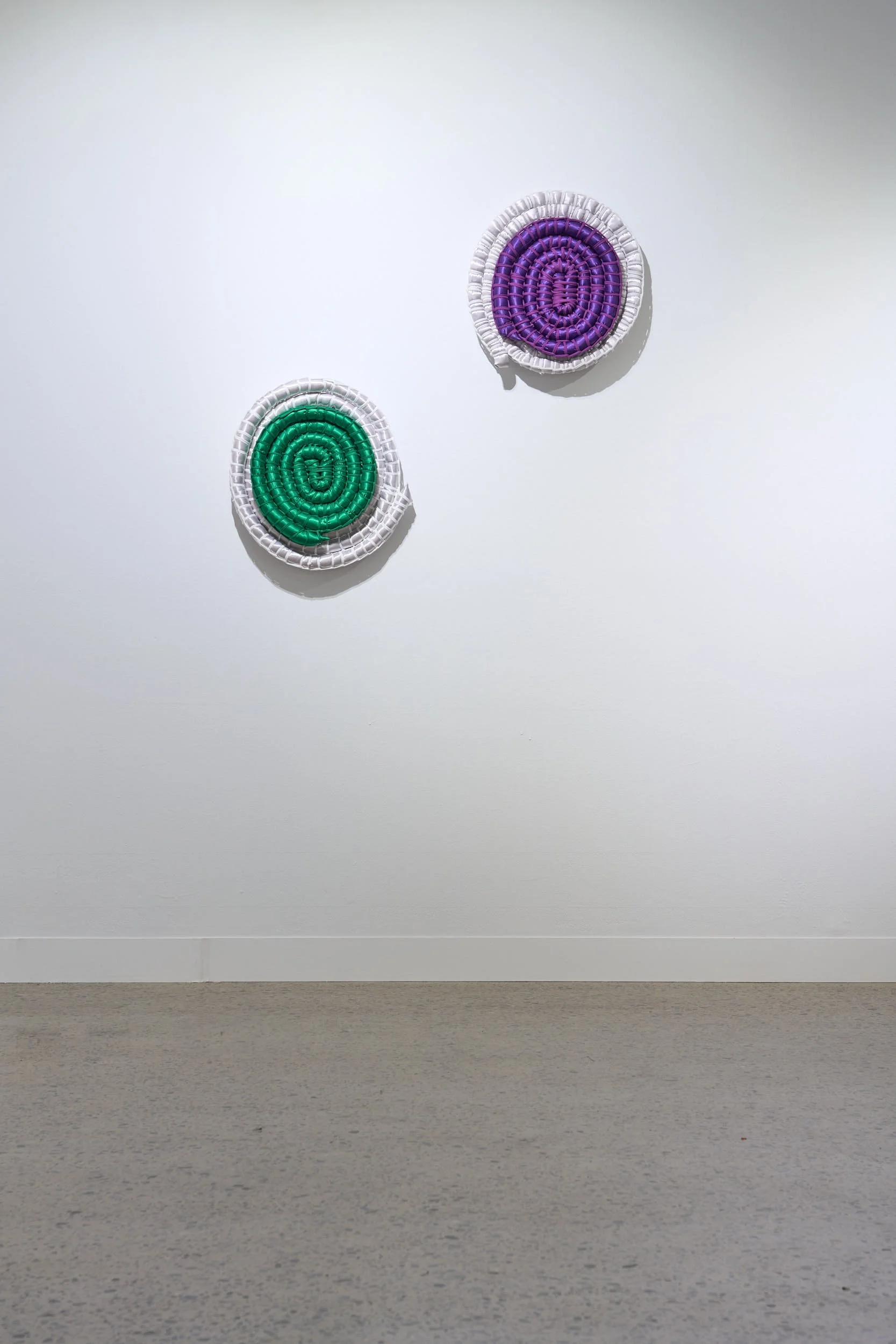 This installation features five large-scale woven “jewels,” made with glistening satin to mimic the sparkle of gemstones yet with a soft, almost toy-like quality. Through weaving, a practice rooted in cultural resilience this work contrasts the strength of Indigenous knowledge with the shallow legacy of colonial power.